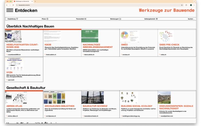 Von den Macher*innen des Schweizer Absriss-Atlas, kommt nun eine Online-Plattform, die Werkzeuge für die Bauwende versammelt. Kürzlich hat Countdown 2030 die Website bauwende.tools veröffentlicht. Damit will der in Basel gegründete Verein, der sich seit 2019 für Klimagerechtigkeit in der Baubranche engagiert, sämtlichen Akteuren aus ebenjener Disziplin Orientierung im Regelwerk-, Produkt- und Bilanzierungsdschungel geben. Ein kurzer Blick auf die Website [...]