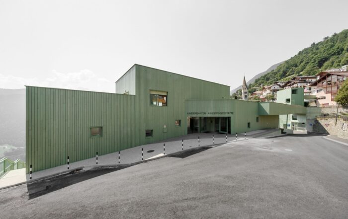 Bildung, Mobilität, Begegnung und Ortsentwicklung – das Projekt des Bozener Büros Roland Baldi Architects für die Südtiroler Gemeinde Barbian vereint gleich mehrere Funktionen in einer städtebaulichen Setzung. Zwei Neubauten, durch eine die Straße überspannende Brücke miteinander verbunden, bilden in steiler Topografie ein neues Tor zum Dorfzentrum. Vertikal angeordnete, grün lasierte Holzlatten bestimmen die Fassaden und lassen das 1.590 Quadratmeter [...]