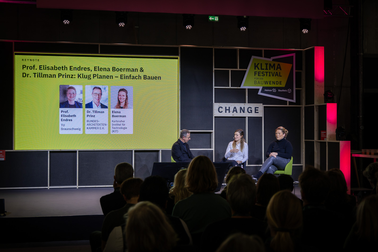 Groß steht der Titel European Green Deal des Thementalks auf der Change-Bühne des Klimafestivals geschrieben: Noch ist nicht ganz klar, was man erwarten darf – Androhung von neuen Gesetzen oder Wissensvermittlung und Erfahrungsaustausch? Der Untertitel Herausforderungen für die Planungswirtschaft und Bauherstellerindustrie lässt vermuten, dass die nächste Stunde informativ werden könnte. Und tatsächlich erläutern die Expert*innen aus der Industrie ihren Umgang mit dem European Green Deal und benennen Vor- und Nachteile der europäischen Gesetzgebung für ihre jeweiligen Bereiche. Die Stimmungsabfrage am Ende zeigt: Die Zuhörenden verlassen die Diskussionsrunde mit einem Wissenszugewinn.