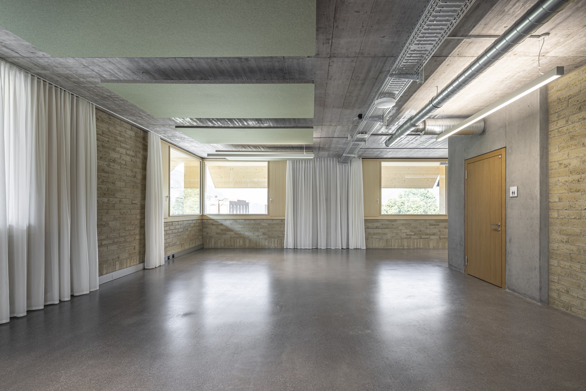 Ziel war die Zertifizierung nach Minergie-A-Eco. Nichttragende Trennwände und Ausfachungen bestehen aus ungebrannten Lehmsteinen, was das Raumklima und zusammen mit Deckensegeln und Vorhängen die Akustik verbessert. Insgesamt konnten so rund 60 Prozent Treibhausgasemissionen eingespart werden.