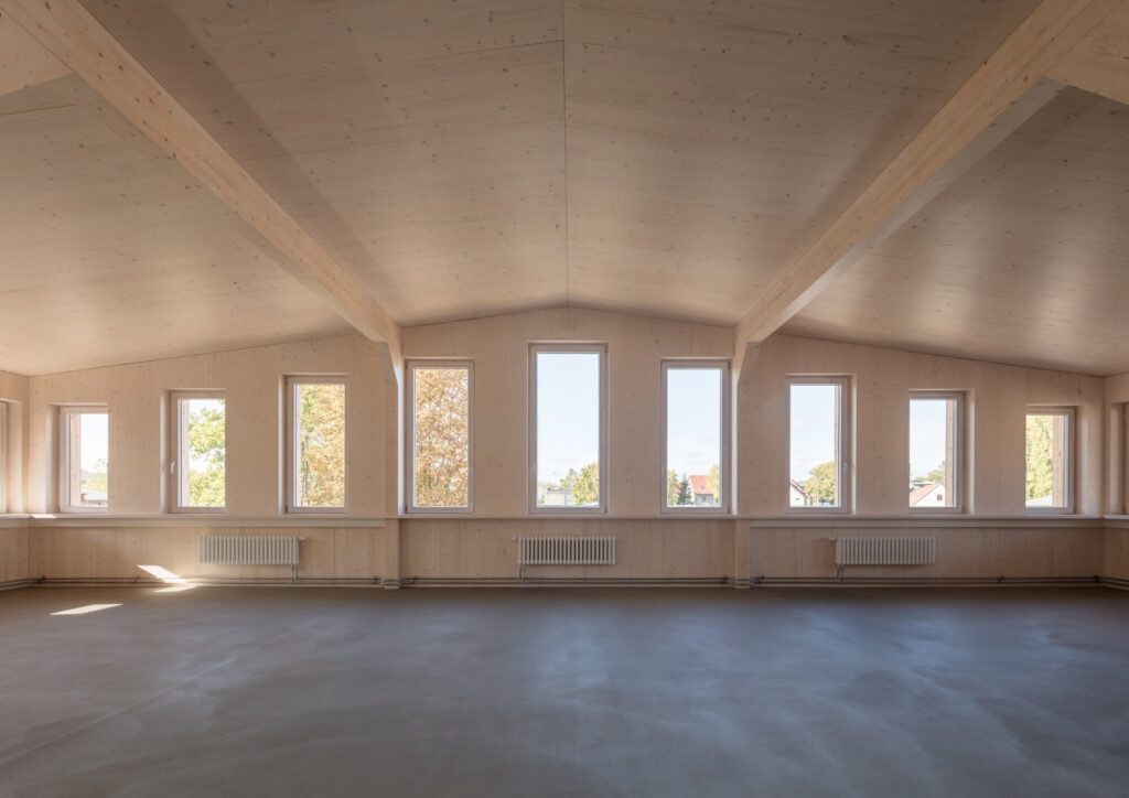 Materialität und Erscheinung des länglichen Baukörpers sind von landwirtschaftlichen Bauten inspiriert, gestalterisch orientierten sich die Architekt*innen vor allem an Scheunen und Speichern. Besonderes Augenmerk lag auf Trennbarkeit und Wiederverwendbarkeit der Baumaterialien. Städtebaulich vermittelt das neue Volumen zwischen den historischen Gutsgebäuden und einer benachbarten Wohnbebauung.