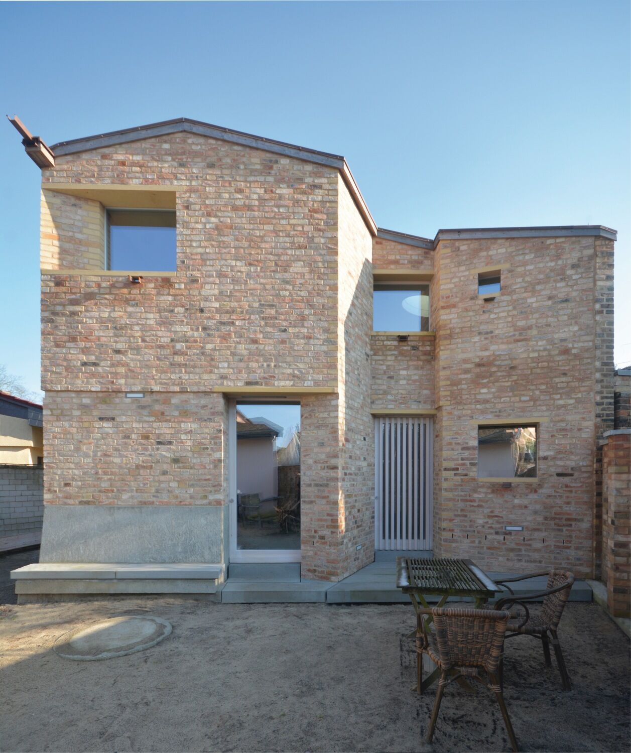 Über einem Stahlbetonsockel, in dem Regenwasserbecken, Sitzbank, Brüstung und Terrasse untergebracht sind, erhebt sich eine Vormauerschale aus wiederverwendeten Reichsformat-Klinkern der früheren Remise. Unterschiedliche Verbände, vertikale Versätze und gezielt eingesetzte Betonfertigteile verleihen dem zweigeschossigen Bau eine kompakte, nahezu monolithische Erscheinung. Unregelmäßig gesetzte Fensteröffnungen und ein skulptural ausgebildeter Wasserspeier am Ende der Dachentwässerung prägen ebenfalls die Außenwirkung.