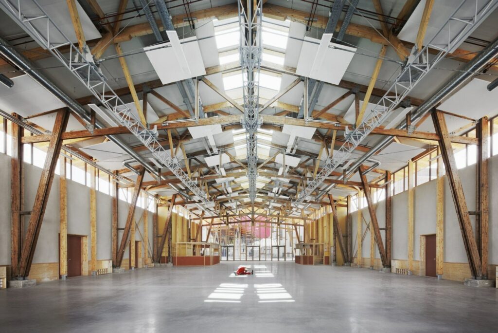 Auch die danebenliegenden Studios mit Sheddächern wurden erweitert. Im hinteren Teil entstand ein Logistikbereich, an der Frontseite kam ein 17 Meter hoher Neubau hinzu, das Studio Zéro. Als fensterlose Black Box wird es ebenfalls für Training und Aufführungen genutzt. Hier gibt es 190 Sitz- und 900 Stehplätze. Beim Material setzten die Architekt*innen konsequent auf regionales Holz und die Wiederverwendung von Bauteilen, die bei den notwendig gewordenen Um- und Rückbauten gewonnen wurden. Insgesamt wurden im Rahmen des Projekts 6.840 Quadratmeter Fläche bearbeitet: 4.940 Quadratmeter wurden saniert, 1.900 Quadratmeter neu errichtet. Die Baukosten lagen bei knapp 12 Millionen Euro.
